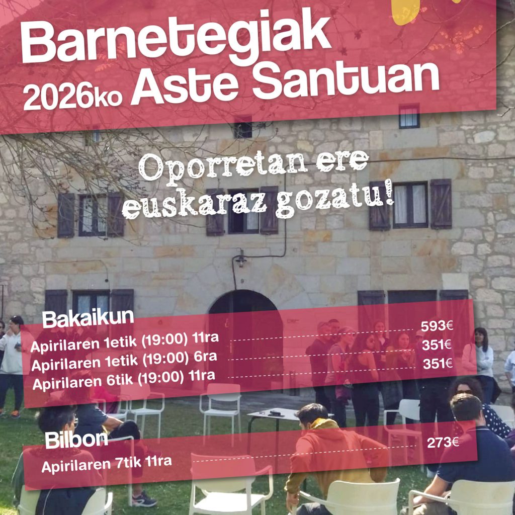 Además de los barnetegis de verano, también organizamos barnetegis para aprender euskara en Semana Santa y semana de Pascua en la casa de Bakaiku, un hermoso caserío situado en Nafarroa, en la Sakana, entre la sierra de Aralar y la sierra de Urbasa, reformado en 2014 y dotado de un moderno equipamiento. En los barnetegis, además de recibir clases y convivir en euskera, nuestros/as alumnos/as realizan excursiones, visitas guiadas y actividades que les dan a conocer aspectos relevantes de la cultura vasca y les ayudan en su proceso de aprendizaje, y es que todas las actividades que proponemos están pensadas para poner en práctica lo aprendido y continuar aprendiendo euskera de manera natural: continuamente se trabaja la comprensión; se interiorizan más naturalmente los conceptos adquiridos y en contextos reales; y se adquiere naturalidad y fluidez en la expresión.